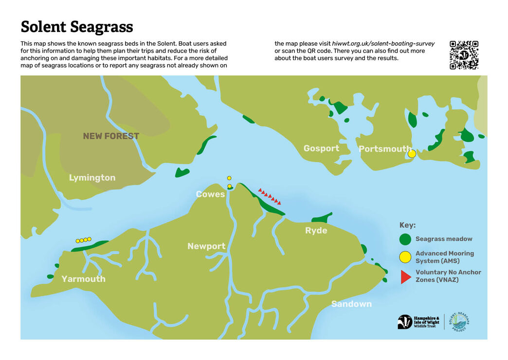 The map was developed in response to the Hampshire and Isle of Wight Wildlife Trust’s Solent Boating Survey, which gathered insights from nearly 600 boat users in the Solent and was carried out as part of their work as a partner in the Solent Seascape Project. The survey showed strong awareness of seagrass and its importance, but identified a lack of clear, trusted information about seagrass locations as one of the main barriers to avoiding damage while anchoring.