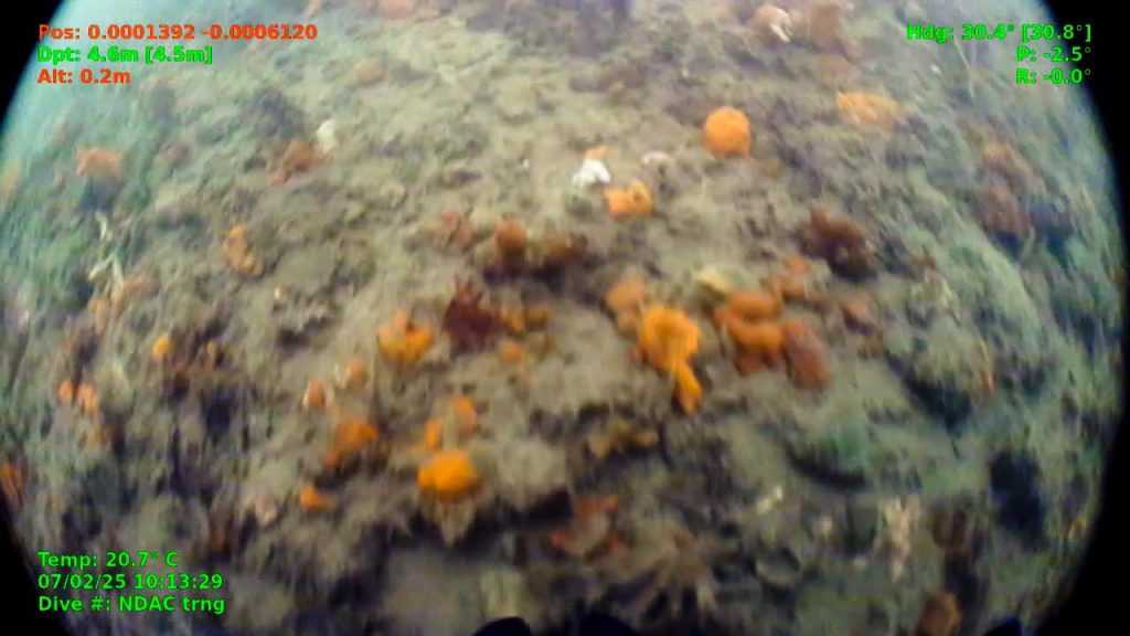 The initial operation took place over the now vibrant reef zone, as well as the surrounding seabed. The contrast was striking: where reef-building materials and oysters had been placed in 2023, the underwater world was filled with life, appearing far richer than the nearby unrestored areas.